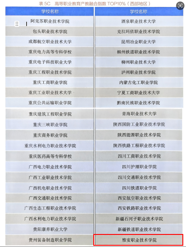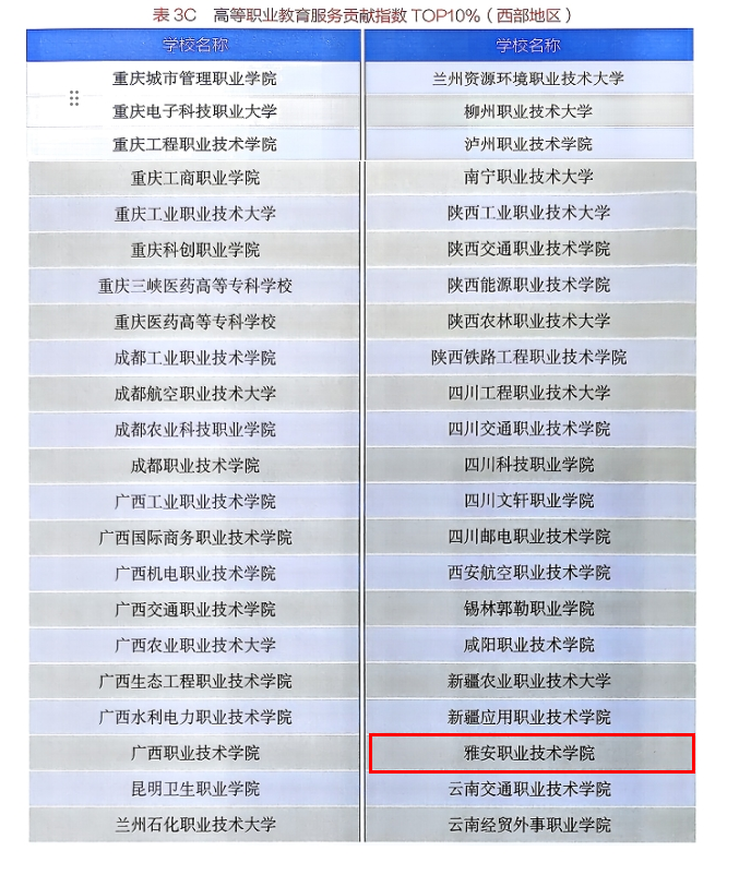 近日,由中国教育科学研究院主编、高等教育出版社出版的《中国职业教育质量报告(2024)》正式发布。我校凭借扎实的办学实力和突出的育人成效,成功入选“服务贡献指数TOP10%”“国际合作指数TOP10%”和“产教融合指数TOP10%”三项高等职业教育西部地区TOP10%榜单,成为区域内为数不多同时斩获三项荣誉的高职院校之一,充分彰显了学校在高职教育领域的强劲综合实力。